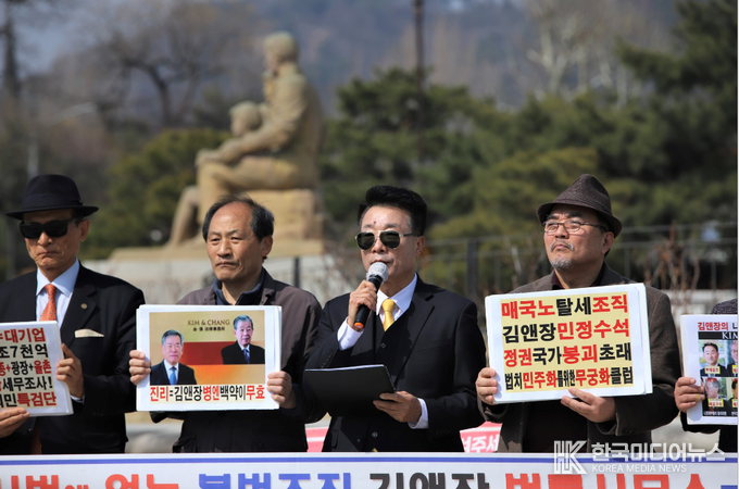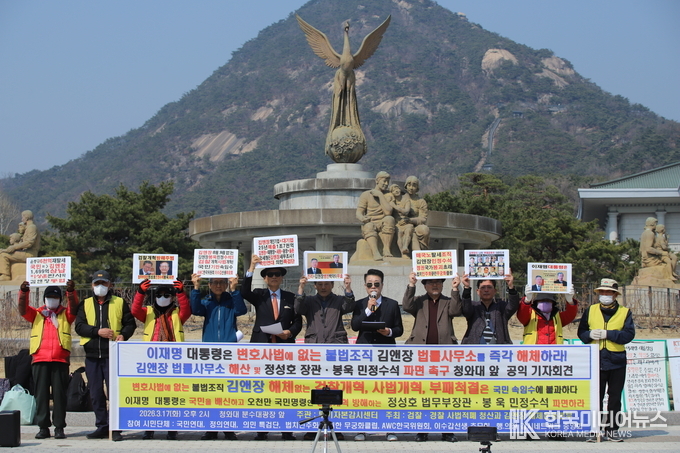 [ 한국미디어뉴스 이원영기자 ] 17일(화) 오후 청와대 분수대 광장 앞에서 ‘검찰·경찰 사법 적폐 청산과 김앤장 해체운동본부’ 주최로 기자회견이 진행됐다. 이날 행사에는 투기자본감시센터, 국민연대, 행·의정 감시네트워크 중앙회, 정의연대, 법치 민주화를 위한 무궁화클럽 등 10여 개 시민사회단체가 참가했다.