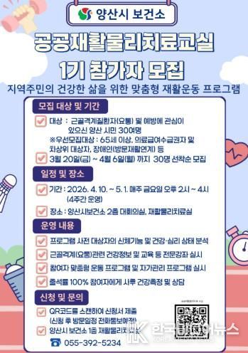 모집 인원은 30명이며, 65세 이상 어르신, 의료급여 수급자, 차상위계층, 장애인 등은 우선 접수 대상이고 양산시보건소 1층 재활물리치료실로 방문 또는 보건소 홈페이지에 업로드된 QR코드를 통해 신청 가능하다.