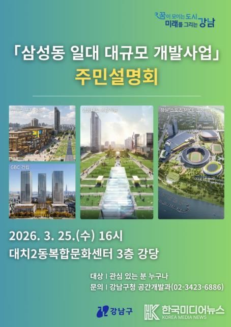 [ 한국미디어뉴스 이보영 기자 ] 꿈이 모이는 도시, 미래를 그리는 강남구가 오는 3월 25일 오후 4시, 대치2동복합문화센터 3층 강당에서 ‘삼성동 일대 대규모 개발사업 주민설명회’를 개최한다.