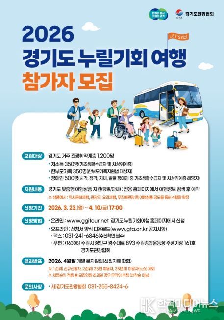 참여를 희망하는 도민은 경기도누릴기회여행 누리집을 통해 신청할 수 있으며, 경기도관광협회 누리집 공지사항을 참고해 팩스 또는 우편으로도 접수할 수 있다.