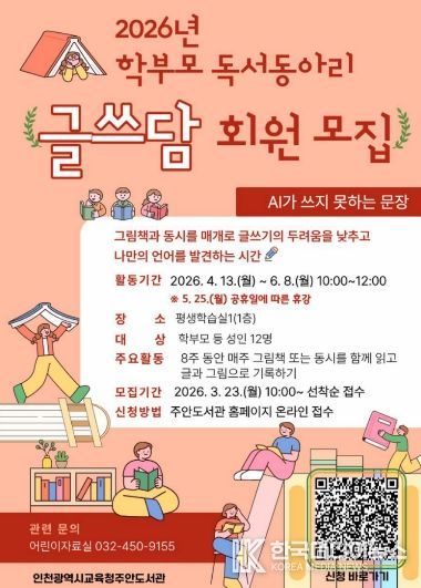 [ 한국미디어뉴스 이원영 기자 ] 인천광역시교육청주안도서관은 학부모의 인문학적 소양을 함양하고 가정 내 독서문화를 확산하기 위하여, 오는 23일부터 학부모 독서동아리 ‘글쓰담’ 회원을 모집한다.
