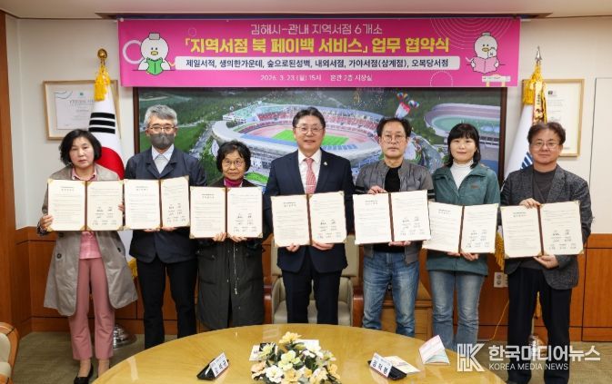 [ 한국미디어뉴스 김홍철 기자 ] 김해시는 23일 오후 3시 시청에서 6개 지역서점과 ‘북 페이백 서비스’ 추진을 위한 업무협약을 체결했다.