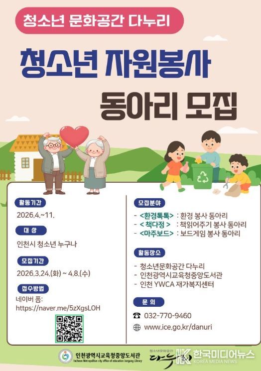 [ 한국미디어뉴스 이원영 기자 ] 인천광역시교육청중앙도서관 청소년문화공간 ‘다누리’는 3월 24일부터 4월 8일까지 인천 관내 청소년을 대상으로 자원봉사 동아리 참여자를 모집한다.