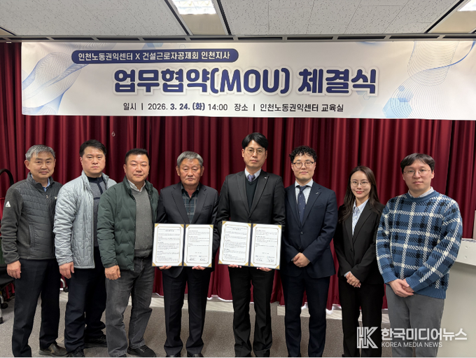 [한국미디어뉴스 이원영기자] 건설근로자공제회 인천지사(지사장 장성호)와 인천노동권익센터(센터장 서흥원)는 24일 인천 연수구 인천노동권익센터에서 취약계층 건설근로자의 복지와 노동권익 향상을 위한 업무협약을 체결했다.