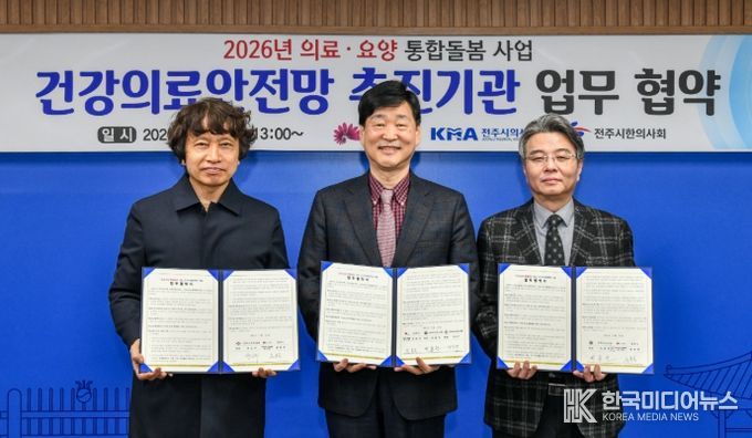 시와 전주시의사회(회장 박용현), 전주시한의사회(회장 박상구)는 24일 시청 3층 회의실에서 윤동욱 전주시장 권한대행 부시장과 박용현 전주시의사회장, 박상구 전주시한의사회장 등이 참석한 가운데 ‘2026 건강-의료안전망 사업 추진을 위한 업무협약’을 체결했다.