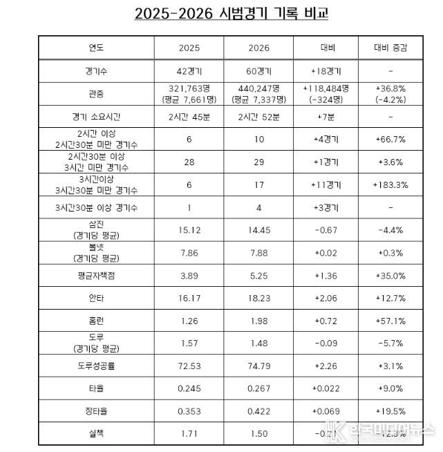 경기 평균 소요 시간은 2시간 52분으로 2025년 대비 7분 늘었으며, 경기당 삼진은 14.45개, 볼넷은 7.88개로 각각 4.4% 감소, 0.3% 증가를 기록했다. 평균자책점은 지난해 3.89에서 5.25로 높아져 35.0%의 증가 폭을 보였다.