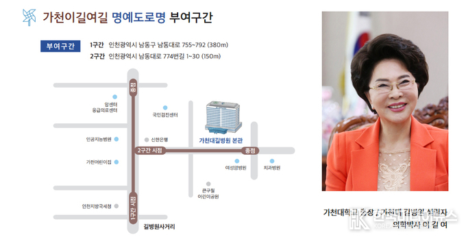 [ 한국미디어뉴스 이원영  기자 ] 가천대 길병원이 위치한 인천광역시 남동구에 설립자 이길여 가천길재단 회장의 이름을 붙인 도로명이 생겼다.