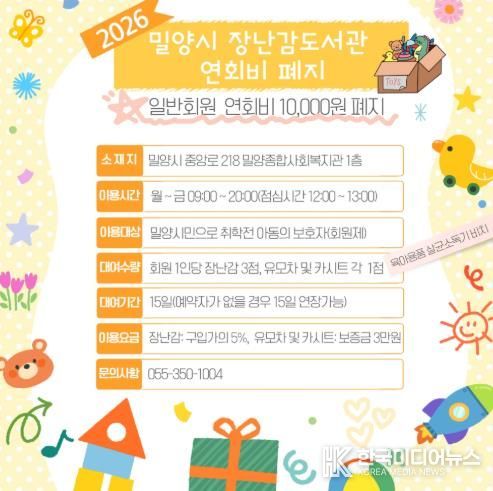[ 한국미디어뉴스 최정화 기자 ] 경남 밀양시가 시민들의 육아 부담을 덜고 장난감도서관 이용을 활성화하기 위해 경남 시(市) 단위 지역 최초로 장난감도서관 연회비를 전면 폐지한다.