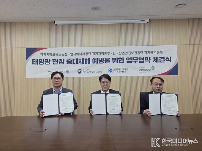 이와 함께 경기지방고용노동청은 한국에너지공단 경기지역본부, 한국산업안전보건공단 경기광역본부와 ‘태양광 건설현장 중대재해 예방을 위한 업무협약’을 체결하고, 태양광 공사 정보 공유, 위험 현장 발굴 및 집중 관리, 안전지원 연계 등 협력체계를 한층 강화하기로 하였다.