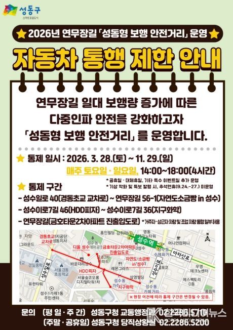 구 관계자는 “연무장길 ‘성동형 보행 안전거리’는 방문객의 안전은 물론 지역 거주민과 상인의 통행권을 모두 고려한 균형 잡힌 교통 안전 정책”이라며, “보행자전용도로 제도화를 통해 더욱 체계적인 운영 기반을 마련하고, 시민 모두가 안심할 수 있는 교통 환경 조성에 최선을 다하겠다”고 말했다.