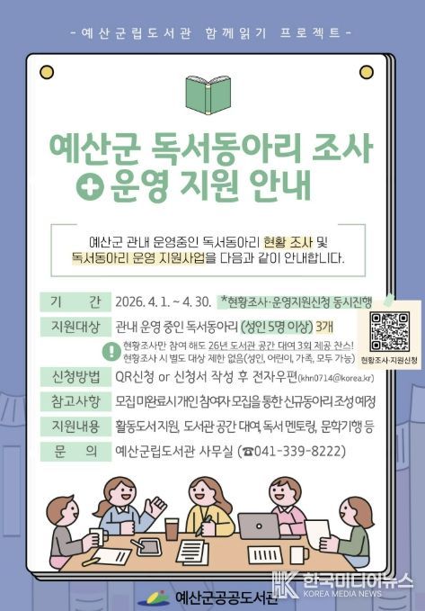 [ 한국미디어뉴스 이원영 기자 ] 예산군 공공도서관은 지역 내 독서동아리 활동을 체계적으로 지원하고 독서공동체 기반을 넓히기 위해 ‘2026 독서동아리 운영 지원사업’을 추진한다.
