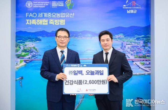 [ 한국미디어뉴스 김홍철 기자 ] 주식회사 일백과 오늘과일은 지난 3월 30일 2천 600만원 상당의 건강식품(과일효소외 4종)을 남해군에 기탁했다.