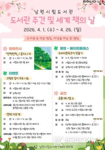 박승용 남원시 교육체육과장은 “도서관주간과 세계 책의 날을 맞아 마련한 다양한 프로그램을 통해 시민 여러분이 책과 더욱 가까워지는 계기가 되길 바란다”며, “앞으로도 도서관이 일상 속 문화와 휴식의 공간으로 자리매김할 수 있도록 다양한 프로그램을 지속적으로 운영하겠다”고 말했다.