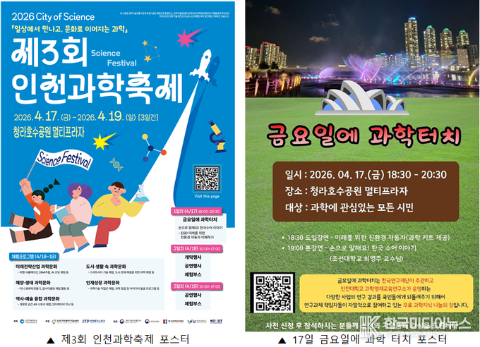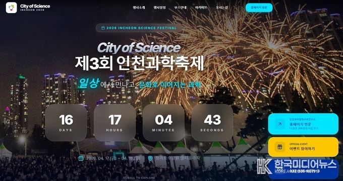 [ 한국미디어뉴스 이원영 기자 ] 인천과학문화거점센터(센터장 한기순)는 오는 4월 17일(금)부터 19일(일)까지 3일간, 인천 서구 청라호수공원 멀티프라자에서 제3회 인천과학축제「City of Science」를 개최한다고 밝혔다. 이번 행사는 4월 과학의 달을 맞아 인천시민과 소통하고, 일상 속에서 과학을 쉽고 즐겁게 체험할 수 있도록 마련된 시민 참여형 과학문화 축제다.