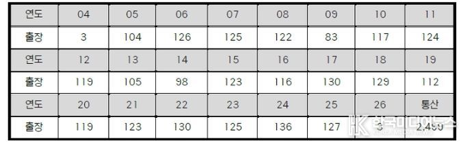 3월 31일 기준 통산 출장 경기 수 10위 이내의 선수 중 강민호가 유일한 포수로 이름을 올리고 있다. 포수 포지션에도 불구하고, 철저한 자기관리로 23년차인 지금까지 단 3시즌을 제외하고 모두 100경기 이상 출장하며 꾸준함을 보여줬다.
