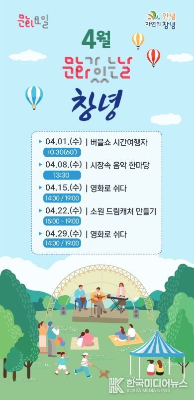 [ 한국미디어뉴스 최정화 기자 ] 창녕군은 4월 한 달간 매주 수요일, 5월부터 11월까지는 첫째·셋째 주 수요일에 창녕문화예술회관에서 ‘2026 구석구석 문화가 있는 날’ 프로그램을 운영한다고 밝혔다.
