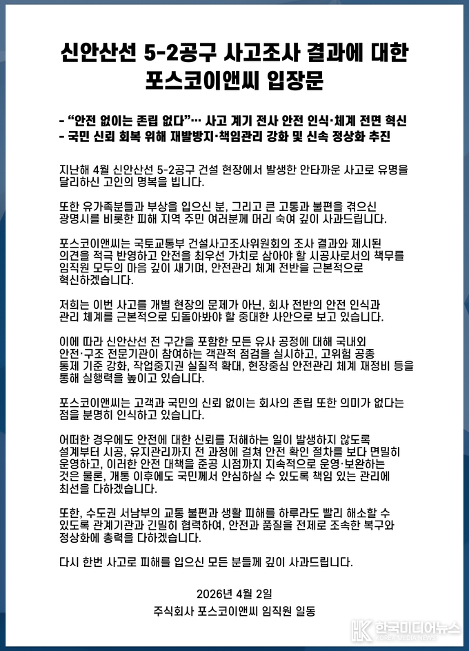 포스코이앤씨는 국토교통부 건설사고조사위원회의 조사 결과와 제시된 의견을 적극 반영하고 안전을 최우선 가치로 삼아야 할 시공사로서의 책무를 임직원 모두의 마음 깊이 새기며, 안전관리 체계 전반을 근본적으로 혁신하겠습니다.