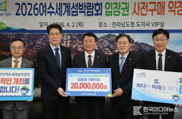 [ 한국미디어뉴스 이종철 기자 ] (재)2026여수세계섬박람회조직위원회는 4월 2일 전남도청 VIP실에서 탑솔라㈜와 ‘2026여수세계섬박람회 입장권 구매약정식’을 개최했다고 밝혔다.