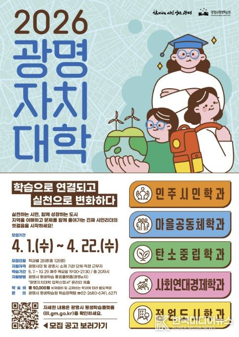 [ 한국미디어뉴스 이원영 기자 ] 광명시가 시의 핵심의제인 평생학습 마을리더 양성과정 ‘광명자치대학’ 2026년 신입생 125명을 오는 22일까지 모집한다.