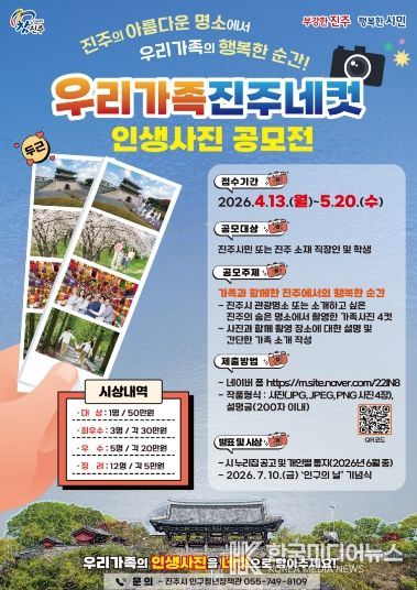[ 한국미디어뉴스 김홍철 기자 ] 진주시는 가족과 함께한 일상 속 행복한 순간을 공유하고 가족 친화적 가치를 확산하며 지역에 대한 애향심을 높이기 위해 2026년 인구정책 '우리 가족 진주 네 컷' 인생사진 공모전을 개최한다.