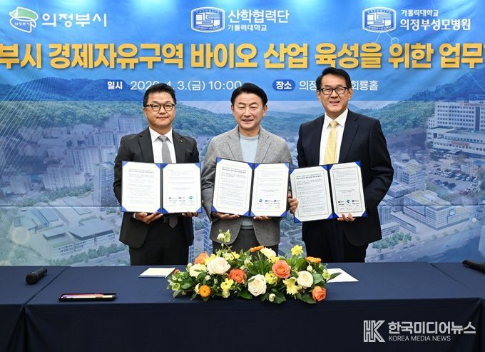 [ 한국미디어뉴스 기자 ] 의정부시는 4월 3일 시청 회룡홀에서 가톨릭대학교 의정부성모병원, 가톨릭대학교 산학협력단과 함께 ‘의정부시 경제자유구역 바이오 산업 육성을 위한 업무협약’을 체결했다.
