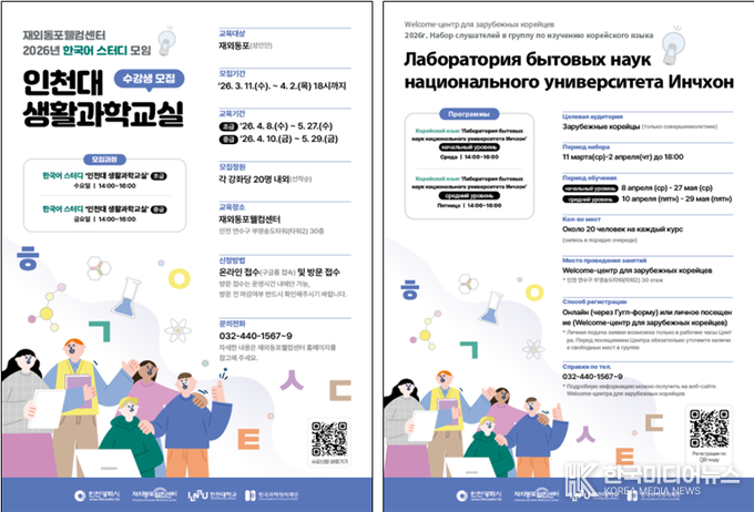 [ 한국미디어뉴스 이원영 기자 ] 인천대학교 과학영재교육연구소(소장 창의인재개발학과 한기순 교수)는 인천광역시와 협력하여 재외동포의 한국어 능력 향상과 지역사회 적응을 지원하기 위한 ‘2026년 한국어 스터디 모임 인천대 생활과학교실’을 운영한다고 밝혔다.