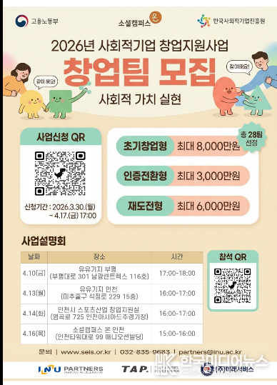 [ 한국미디어뉴스 이원영 기자 ] 국립대학법인 인천대학교(총장 이인재)는 인천 지역 기반의 사회적기업 창업을 활성화하고 지역문제 해결형 창업생태계를 조성하기 위해 「2026년도 사회적기업 창업지원사업」창업팀 모집을 모집한다고 밝혔다.