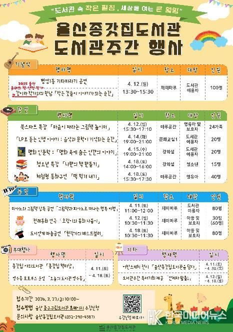[ 한국미디어뉴스 이보영 기자 ] 울산 중구가 제62회 도서관의 날·도서관 주간(4. 12.~4. 18.)을 맞아 4월 11일부터 4월 18일까지 지역 내 도서관 10곳에서 ‘2026년 도서관의 날·도서관 주간 행사’를 개최한다.