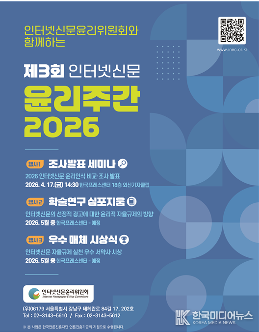 [ 한국미디어뉴스 이원영 기자 ] 인터넷신문 유일의 독립적 자율규제기관인 인터넷신문윤리위원회(위원장 이재진, 이하 인신윤위)는 오는 17일 ‘제3회 인터넷신문윤리주간 2026’을 개최하고, 인터넷신문의 윤리의식과 자율규제 방향을 점검하는 자리를 갖는다고 7일 밝혔다. (첨부 포스터 참조)