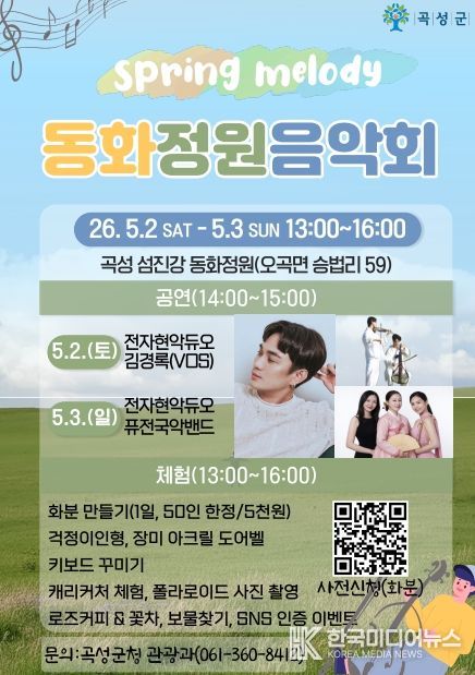 곡성군 관계자는 “봄꽃이 어우러진 동화정원에서 아름다운 음악과 함께 곡성의 매력을 더욱 깊이 느껴보시길 바란다”라고 전했다.