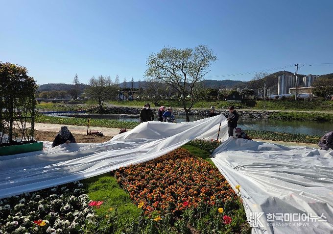 특히 꽃강길 일원에 식재된 초화류는 저온과 외부 환경 변화에 매우 민감해 일시적인 기온 저하에도 생육 저하나 꽃잎 손상으로 이어질 수 있어, 군은 서리 피해가 우려되는 주요 구간을 중심으로 부직포를 활용한 보온·보호 조치를 신속히 시행했다.