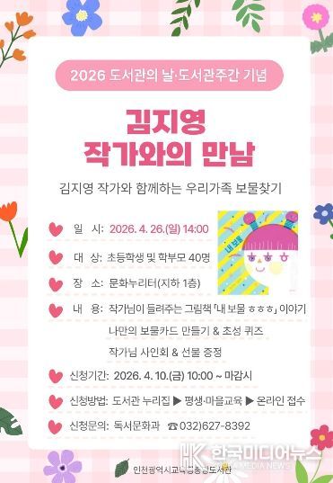 [ 한국미디어뉴스 이원영 기자 ] 인천광역시교육청중앙도서관은 오는 26일, 초등학교 저학년 어린이와 가족을 대상으로 김지영 그림책 작가와의 만남을 운영한다.