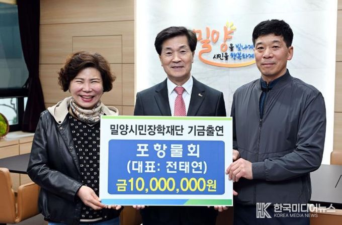 [ 한국미디어뉴스 최정화 기자 ] (재)밀양시민장학재단은 9일 포항물회로부터 지역 인재 육성을 위한 장학기금 1천만원을 기탁받았다고 밝혔다.