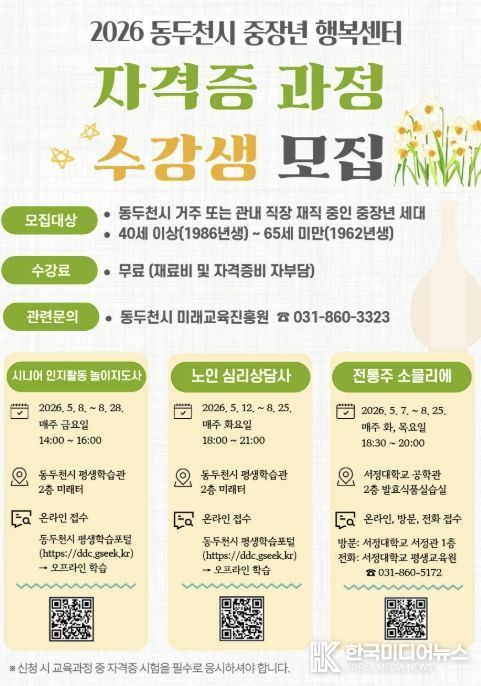 [ 한국미디어뉴스 김서안 기자 ] 동두천시 미래교육진흥원은 지역 내 중장년층의 성공적인 인생 2막과 안정적인 사회 참여를 지원하기 위해 ‘2026년 중장년 행복센터 자격증 과정’ 수강생을 모집한다고 밝혔다.