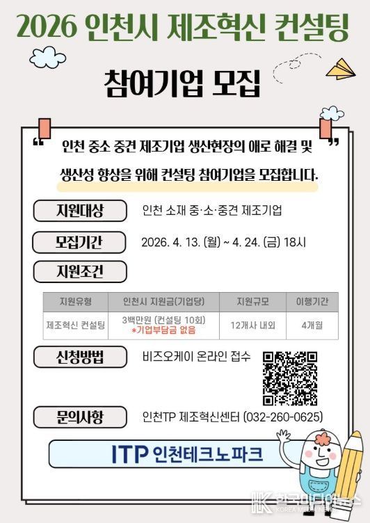 [ 한국미디어뉴스 이원영 기자 ] 인천테크노파크(인천TP)는 지역 중소·중견기업 제조 현장의 스마트화와 AX(AI 전환)·DX(디지털 전환)를 촉진하기 위해 ‘2026 인천시 제조혁신 컨설팅 지원사업’ 참여기업을 24일까지 모집한다고 밝혔다.