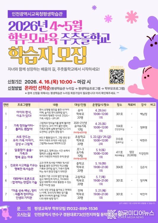 [ 한국미디어뉴스 이원영 기자 ] 인천광역시교육청평생학습관은 학부모의 자녀 발달 이해를 돕고 미래 교육 역량을 강화하기 위해, 4월 25일부터 5월 29일까지 학부모 교육과정인 ‘주춧돌학교’를 운영한다.