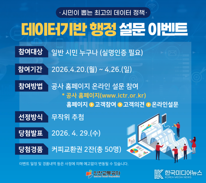 [ 한국미디어뉴스 이원영 기자 ] 인천교통공사(사장 최정규)는 오는 20일부터 26일까지 데이터·AI 기반 정책에 대한 시민 의견을 듣기 위한 설문 이벤트를 실시한다고 16일 밝혔다.