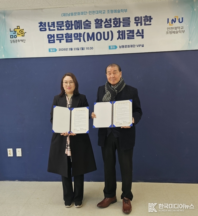 [ 한국미디어뉴스 이원영 기자 ] 인천대학교 조형예술학부(학부장 장경애)는 지난 3월 23일 (재)남동문화재단(대표이사 김재열)과 지역 문화예술 활성화 및 청년 예술가 지원을 위한 업무협약(MOU)을 체결했다.