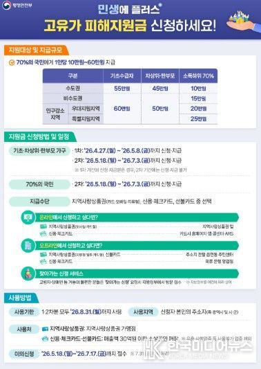 이어 2차 신청 대상자인 소득 하위 70%(약 13만 명 추산)에게도 10만 원을 지급해 유가 상승으로 인한 물가 부담을 전방위적으로 완화할 계획이다.