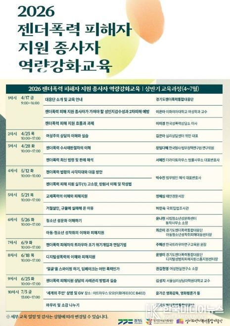 [ 한국미디어뉴스 김일규 기자 ] 경기도와 경기도젠더폭력통합대응단이 17일 도내 젠더폭력 피해 지원 현장 종사자들의 전문성 향상을 위한 ‘2026 역량강화 교육’ 상반기 과정을 시작하며 현장 대응력 강화에 나섰다.