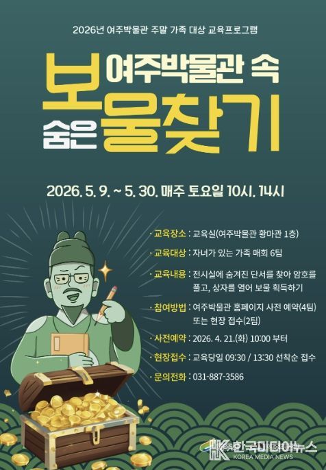 [ 한국미디어뉴스 이원영 기자 ] 여주시 여주박물관은 가정의 달 5월을 맞아 가족이 함께 지역 문화유산의 가치를 즐겁게 배우고 체험할 수 있는 ‘여주박물관 속 숨은 보물찾기’를 운영한다.