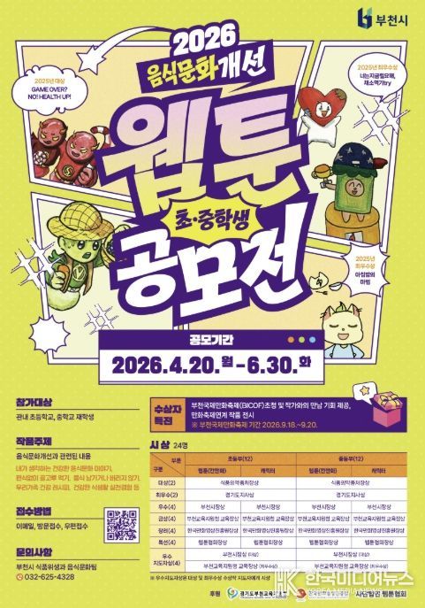 [ 한국미디어뉴스 김만길 기자 ] 부천시는 4월 20일부터 6월 30일까지 ‘2026년 음식문화개선 초중학생 웹툰·캐릭터 공모전’을 연다. 이번 공모전은 학생들이 일상 속 음식문화를 주제로 직접 창작에 참여함으로써 올바른 식문화에 대한 인식을 높이기 위해 매년 추진되고 있다.