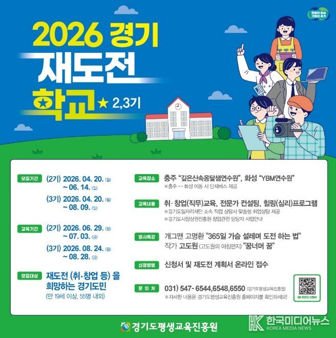 [ 한국미디어뉴스 김일규 기자 ] 경기도와 경기도평생교육진흥원은 취업이나 창업 실패를 경험한 도민의 재기를 지원하기 위해 오는 20일부터 ‘2026년 경기 재도전학교’ 2~3기 참가자를 각각 55명 내외로 모집한다.
