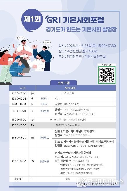 [ 한국미디어뉴스 김일규 기자 ] 경기연구원은 오는 23일 오후 3시 수원컨벤션센터 403호에서 ‘경기도가 만드는 기본사회 실험장’을 주제로 ‘제1회 GRI 기본사회포럼’을 개최한다.