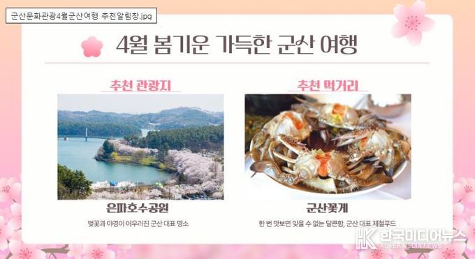 [ 한국미디어뉴스 이종철 기자 ] 군산시는 계절과 시기에 맞는 관광 정보를 한눈에 제공하는 ‘월별 추천 콘텐츠 알림창 서비스’를 오는 5월부터 본격 운영한다고 밝혔다.