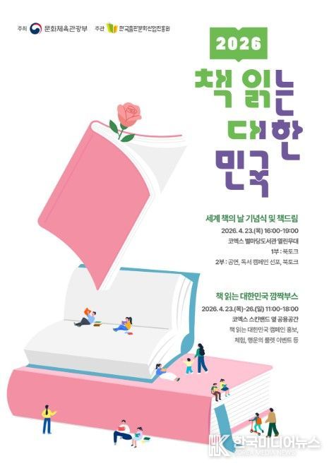 [ 한국미디어뉴스 이원영 기자 ] 문화체육관광부는 한국출판문화산업진흥원, (재)책읽는사회문화재단과 함께 4월 23일 오후 4시, 서울 코엑스 별마당도서관에서 대국민 독서 캠페인 ‘2026 책 읽는 대한민국’의 시작을 선포하고 캠페인을 본격적으로 추진한다. ‘책 읽는 대한민국’은 인공지능(AI) 시대에 국민의 생각하는 힘을 기르고, 지역 곳곳에 ‘일상 속 책 읽는 즐거움’을 확산하기 위해 마련한 캠페인이다. 최휘영 장관은 캠페인 선포식을 찾아 ‘책 읽는 즐거움’ 확산에 앞장선다.