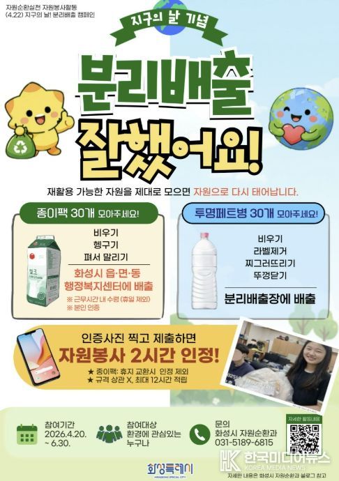 [ 한국미디어뉴스 이원영 기자 ] 화성특례시가 2026년 ‘지구의 날(4월 22일)’을 맞아 시민들이 일상 속에서 환경 보호를 실천할 수 있는 자원봉사 활동 '분리배출 잘했어요' 캠페인을 운영한다고 밝혔다.
