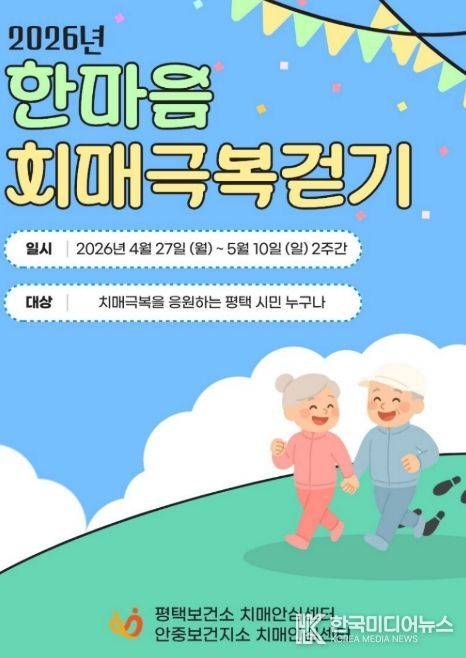 [ 한국미디어뉴스 이보영 기자 ] 평택보건소 치매안심센터와 안중보건지소 치매안심센터에서는 지역 주민의 치매 예방과 인식개선을 위해 녪년 한마음 치매극복 걷기 행사’를 오는 4월 27일부터 5월 10일까지 2주간 진행한다.