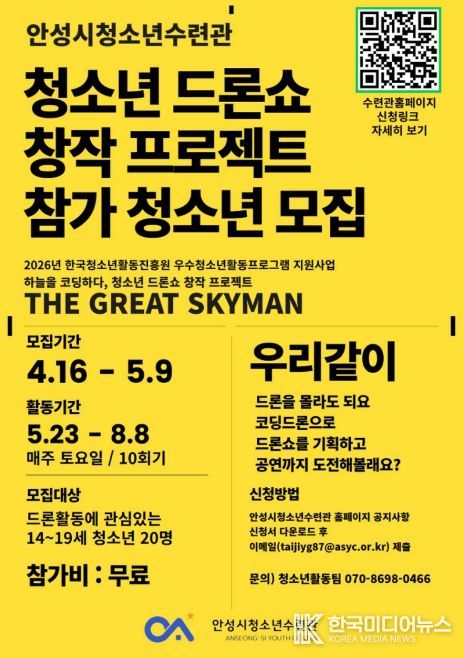 [ 한국미디어뉴스 이보영 기자 ] 안성시청소년수련관은 미래 디지털 인재 양성을 위한 청소년 참여형 프로그램 '하늘을 코딩하다, 청소년 드론쇼 창작 프로젝트 ‘THE GREAT SKYMAN’'에 참여할 청소년을 4월 16일 ~ 5월 8일까지 모집한다고 밝혔다.