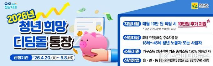 윤연화 전남도 인구청년이민국장은 “청년 희망디딤돌 통장은 일하는 청년이 안정적으로 목돈을 마련하도록 돕는 대표적 자산형성 정책”이라며 “앞으로도 청년의 지역 정착과 자립을 지원하는 맞춤형 정책을 지속해서 확대하겠다”고 말했다.